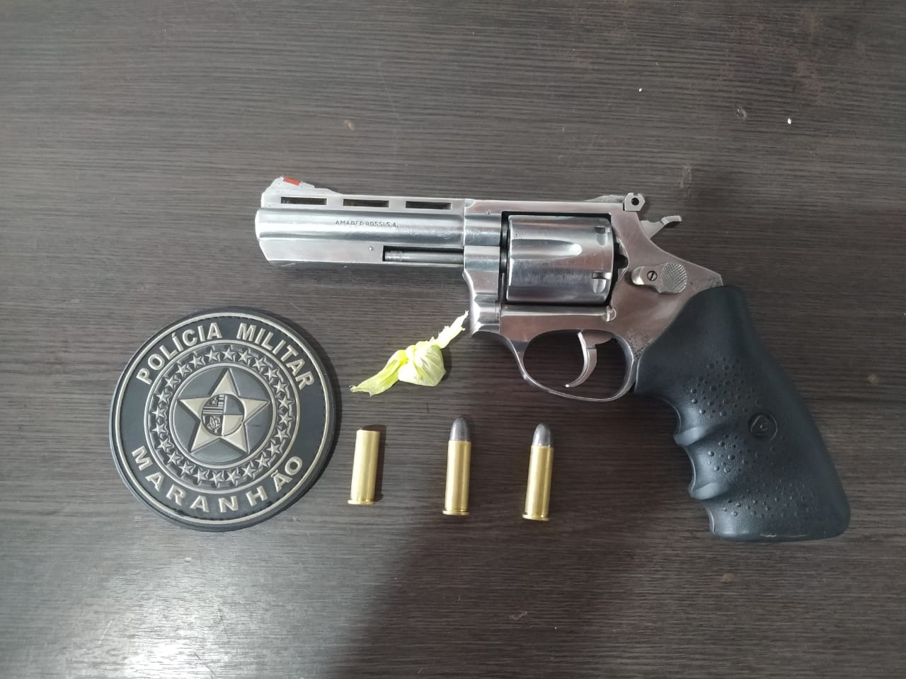 Após buscas na área os policiais encontraram o suspeito e a arma de fogo, um revólver calibre 38, com duas munições intactas e uma deflagrada, foi encontrada também uma trouxa com uma substância análoga à maconha na posse do conduzido.