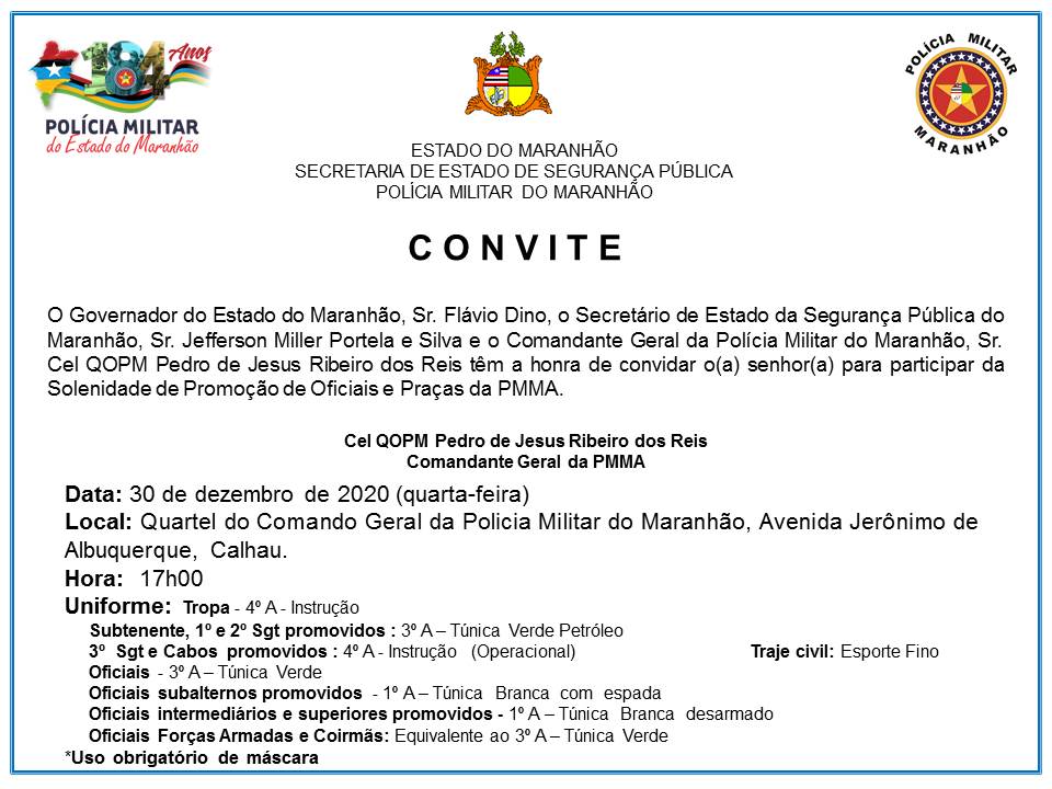 A Polícia Militar (PMMA) realiza nesta quarta-feira (30), às 17h, no pátio externo do Quartel do Comando Geral, no Calhau , a solenidade de promoção de oficiais e praças. No total serão 310 praças e 65 oficiais promovidos da capital e do interior do Estado.