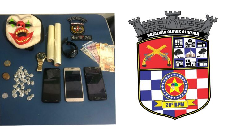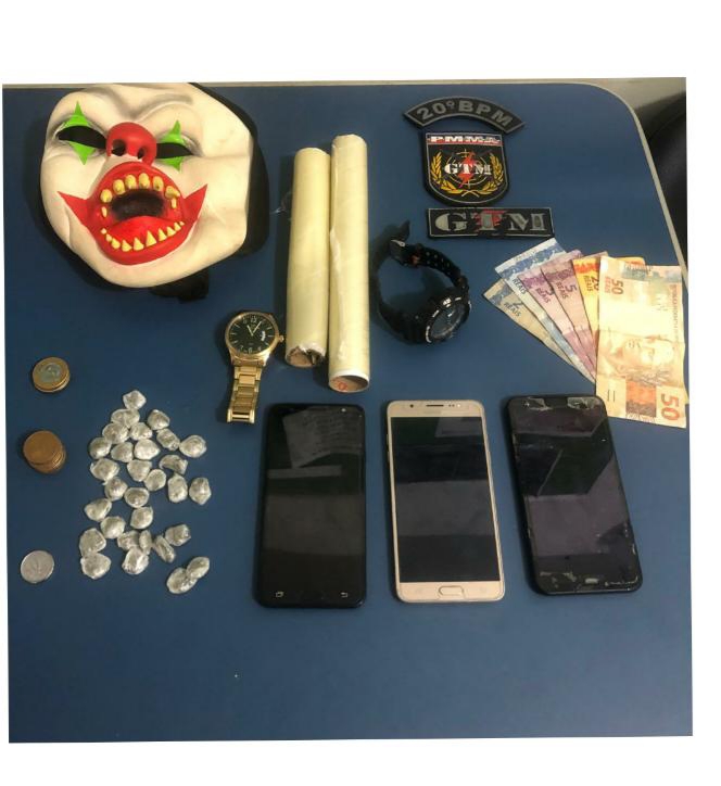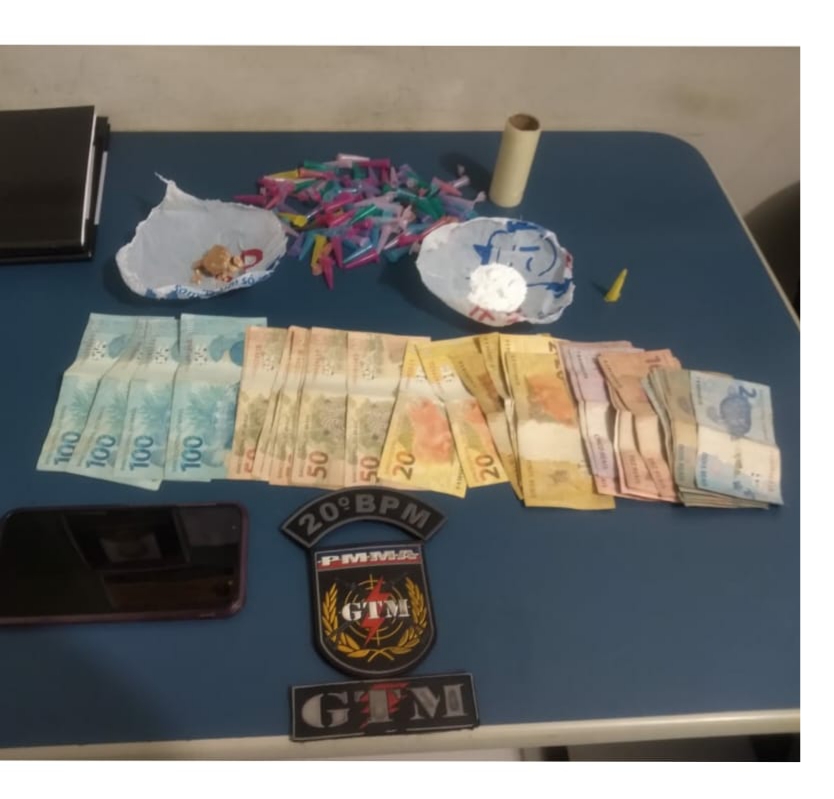 Após denúncias de tráfico de drogas no Parque Jair, em São José de Ribamar, a equipe Tática do 20°BPM deslocou-se para averiguar a situação, no local os pms procederam a abordagem e encontraram junto aos suspeitos: trinta (30) porções de substância semelhante à maconha, uma quantia de R$ 91,00 reais, dois rolos de papel, utilizado para embalar a droga, três celulares, dois relógios e uma máscara.