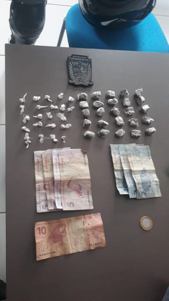 Durante a abordagem, com o suspeito foi encontrado 23 trouxinhas de substância com características de crack e 25 trouxinhas de substância com características de maconha, além de uma quantia em dinheiro trocado no valor de R$ 37,00. As trouxinhas que o indivíduo se desfez foram todas recolhidas pela guarnição.