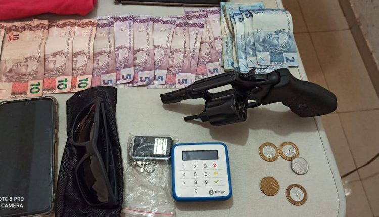 Com os suspeitos foram apreendido, quatro cartões, dois óculos, um revólver Taurus calibre 38, seis munições, dois celulares sendo um Samsung e um Motorola, um porta cédula, um Chevrolet Onix de cor branca, placa QQW-3346, uma máquina de cartão Samup e R$ 201,75 (duzentos e um reais e setenta e cinco centavos).