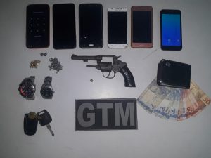 Os indivíduos tentaram empreender fuga, mas foram interceptados pela guarnição policial. Em seguida, foi realizada a revista pessoal, encontrando com os suspeitos 1 (um) revólver calibre 32, 1 (uma) munição, 6 (seis) celulares , uma quantia no valor de R$ 107 reais, 2 relógios, 2 (dois) cordões, 2 (duas) chaves de carro e 1 (uma) carteira porta cédulas com documentos.