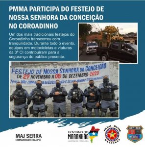 A Polícia Militar do Maranhão, por meio da 3ª Companhia Independente da Polícia Militar (3ª CI), localizada no Bairro do Coroadinho, garantiu a segurança do Festejo de Nossa Senhora da Conceição, que ocorreu de 29 de novembro a 8 de dezembro, no Polo Coroadinho. Durante os dez dias de evento, policiais militares do motopatrulhamento e equipes em viaturas acompanharam a programação do festejo, dando segurança aos fiéis que participaram das atividades deste ano.