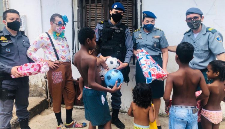 A Polícia Militar por meio do Comando de Segurança Comunitária-PROERD, Batalhão Escolar e Patrulha Maria da Penha, distribuíram, na manhã desta segunda-feira (12), brinquedos às crianças do Parque Vitória.