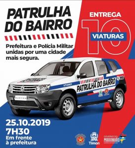 A Polícia Militar do Maranhão (PMMA) recebeu, na manhã de sexta-feira (25), 10 viaturas destinadas ao programa “Patrulha no Bairro”. Esse programa é uma parceria entre a Prefeitura Municipal de Timon-MA e a PMMA, e será executado pelo 11º Batalhão de Polícia Militar do Maranhão, responsável pelo policiamento naquela área.