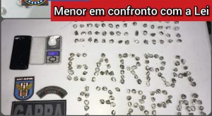 Em ocorrência simultânea, policiais do Grupo Garra da 2°Companhia do 13°BPM, apreenderam menor em conflito com a lei, em flagrante delito, com uma quantia de 20 (vinte) trouxinhas de substância similar a maconha e 01 (uma) balança de precisão. Logo em seguida, o menor relatou aos policiais que havia mais entorpecentes enterrados no quintal da sua casa.
