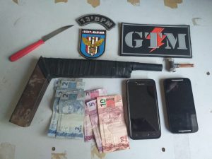 A Equipe policial do GTM do 13º Batalhão o assumir serviço, foi acionada por populares em decorrência de um assalto a mão armada em uma loja de celulares no bairro J. câmara I. De imediato, os policiais se deslocaram em uma ação rápida onde localizaram o suspeito que portava um simulacro de arma de fogo e todo o material do roubo.