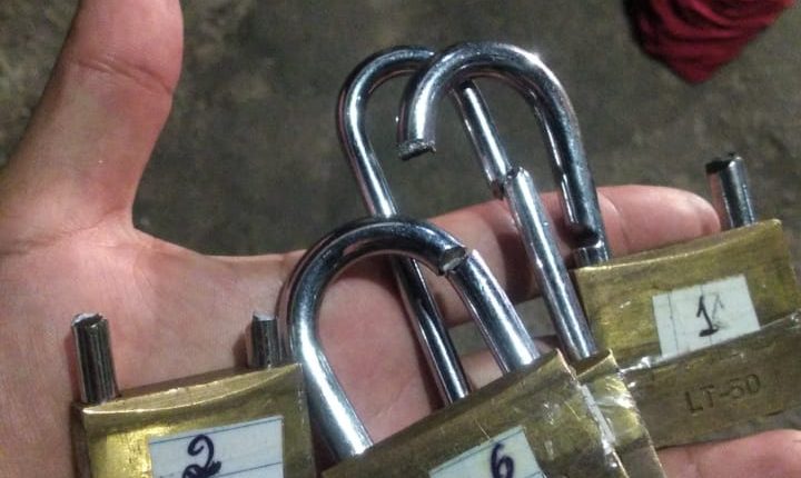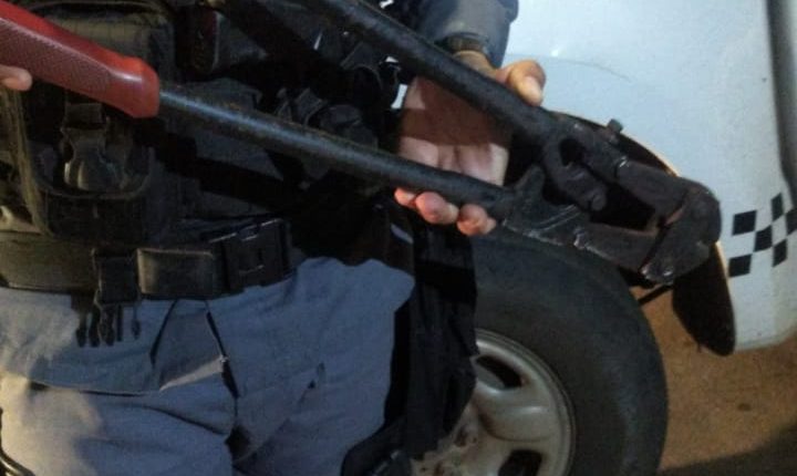 Os policiais entraram no estabelecimento e encontraram dois homens praticando a ação delituosa. Foi feita a abordagem e revista, sendo encontrados um alicate de corte de cadeados, tipo tesoura e vários cadeados cotados.