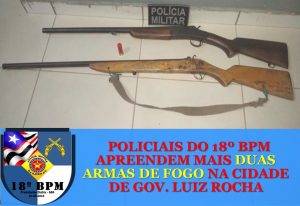 Na tarde de domingo (18), ao realizar rondas pelo bairro Boca da Mata, na cidade de Governador Luiz Rocha-MA, a guarnição de serviço do 18º BPM, sediado em Presidente Dutra-MA, avistou dois indivíduos em uma motocicleta Honda Fan, preta, sem placa e portando arma de fogo. Os policiais iniciaram o acompanhamento tático e quando os suspeitos perceberam que seriam abordados dispensaram as armas e seguiram por uma estrada de terra. Os policiais encerram a perseguição e recolheram uma espingarda calibre 12 com uma munição intacta e uma espingarda bate bucha.