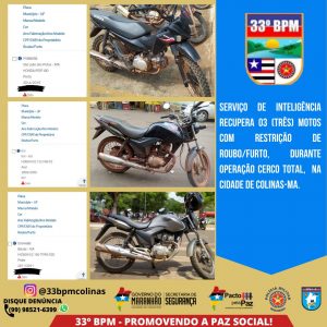 Três motocicletas com restrição de roubo/furto foram recuperadas na manhã desta sexta-feira (25),  por policiais militares do 33º BPM, na cidade de Colinas.