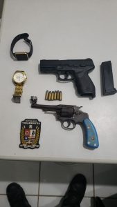 Junto aos homens foi encontrada uma arma de fogo, calibre 32, com seis munições, duas deflagradas e quatro intactas; um simulacro de arma de fogo, dois relógios de pulso, um anel e uma smart TV.