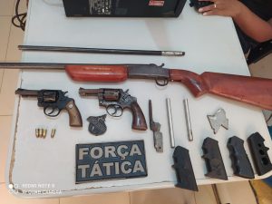 Com base nas informações, a guarnição da Força Tática iniciou a averiguação e chegando no local, o autor autorizou a equipe policial a fazer buscas no local. Durante as buscas foram encontradas três armas de fogo, bem como carcaças para fábrica de armas artesanais