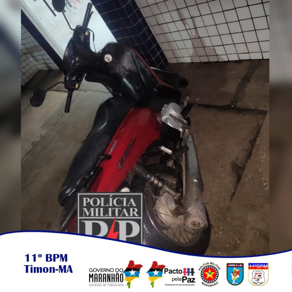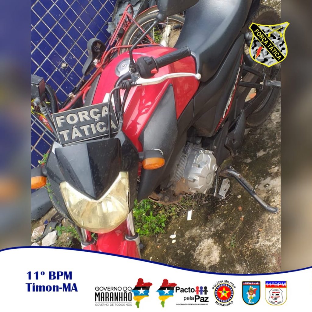Motocicleta é recuperada após ação dos policiais do 11º Batalhão da PMMA no Bairro Miguel Arrais nesta terça-feira (23). A guarnição policial da Força Tática realizava rondas pelo bairro quando deparou-se com alguns indivíduos em atitude suspeita. Estes por sua vez, ao avistarem a viatura policial, empreenderam fuga e adentraram em um matagal, abandonando uma motocicleta.